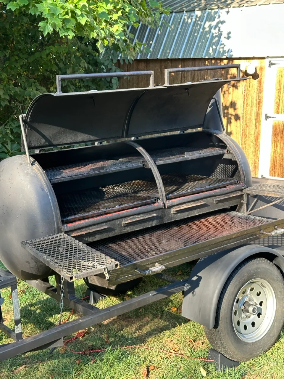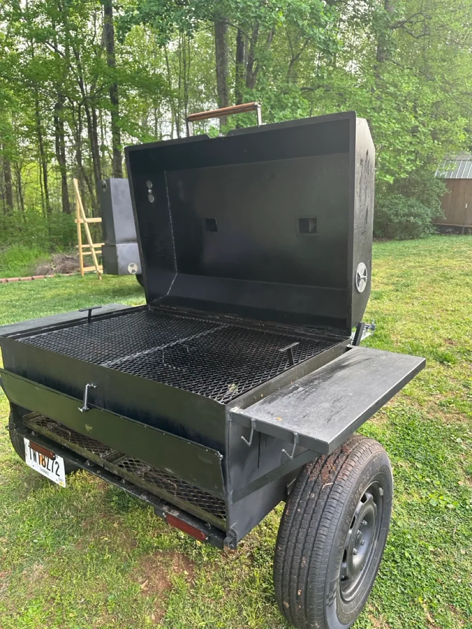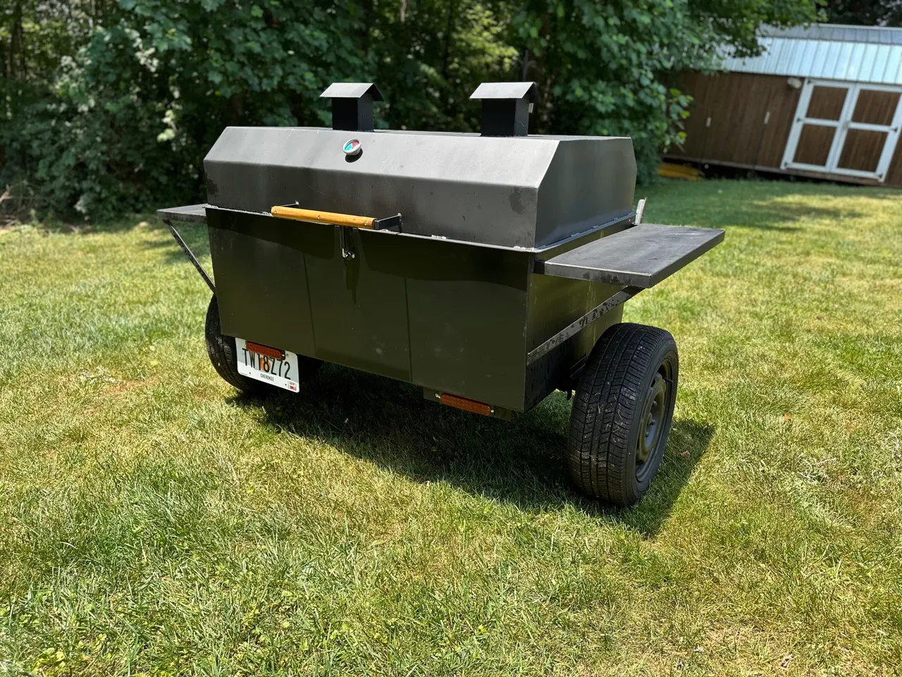 Description: All steel smoker grill with 3 sections. Front section is a grilling compartment with two cooking surfaces made of expanded metal. Center section is the smoker with two cooking surfaces made of expanded metal. Back section is divided into two compartments. The top compartment is a warmer compartment built on top of the lower compartment fire box. The warmer compartment has 3 warmer racks made of expanded metal. The fire box has an expanded metal grate for managing the fire on and lower section where ash and coals collect. Grill also has a paper towel holder and grill utensils holder. Grill has an integrated trailer axel and trailer tongue so it can be easily transported by vehicle with a trailer hitch and 2 inch receiver ball. Integrated lights require a 4 pin trailer light adapter.