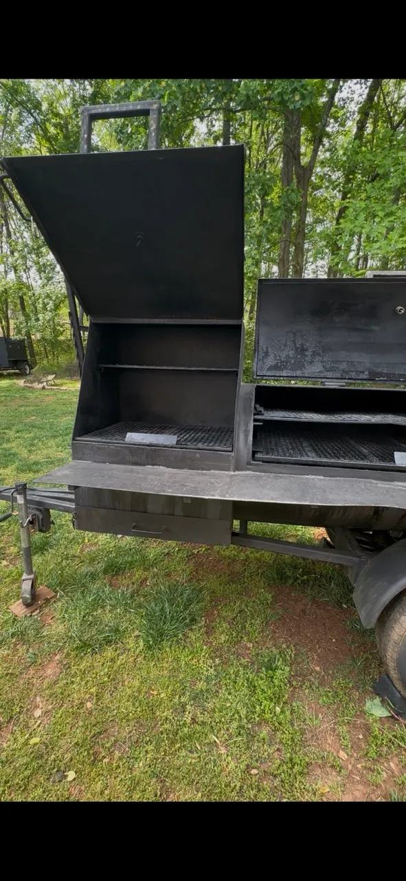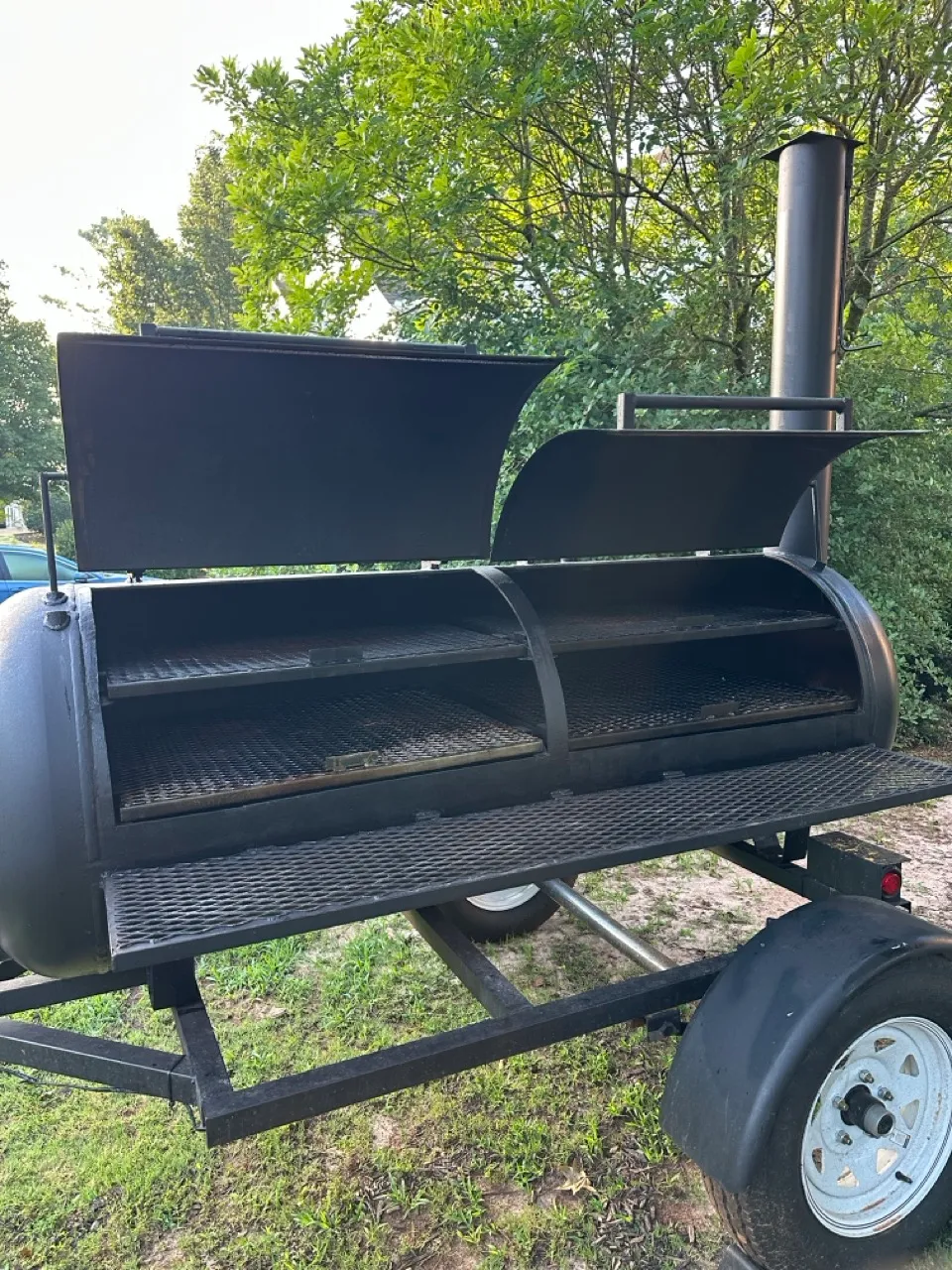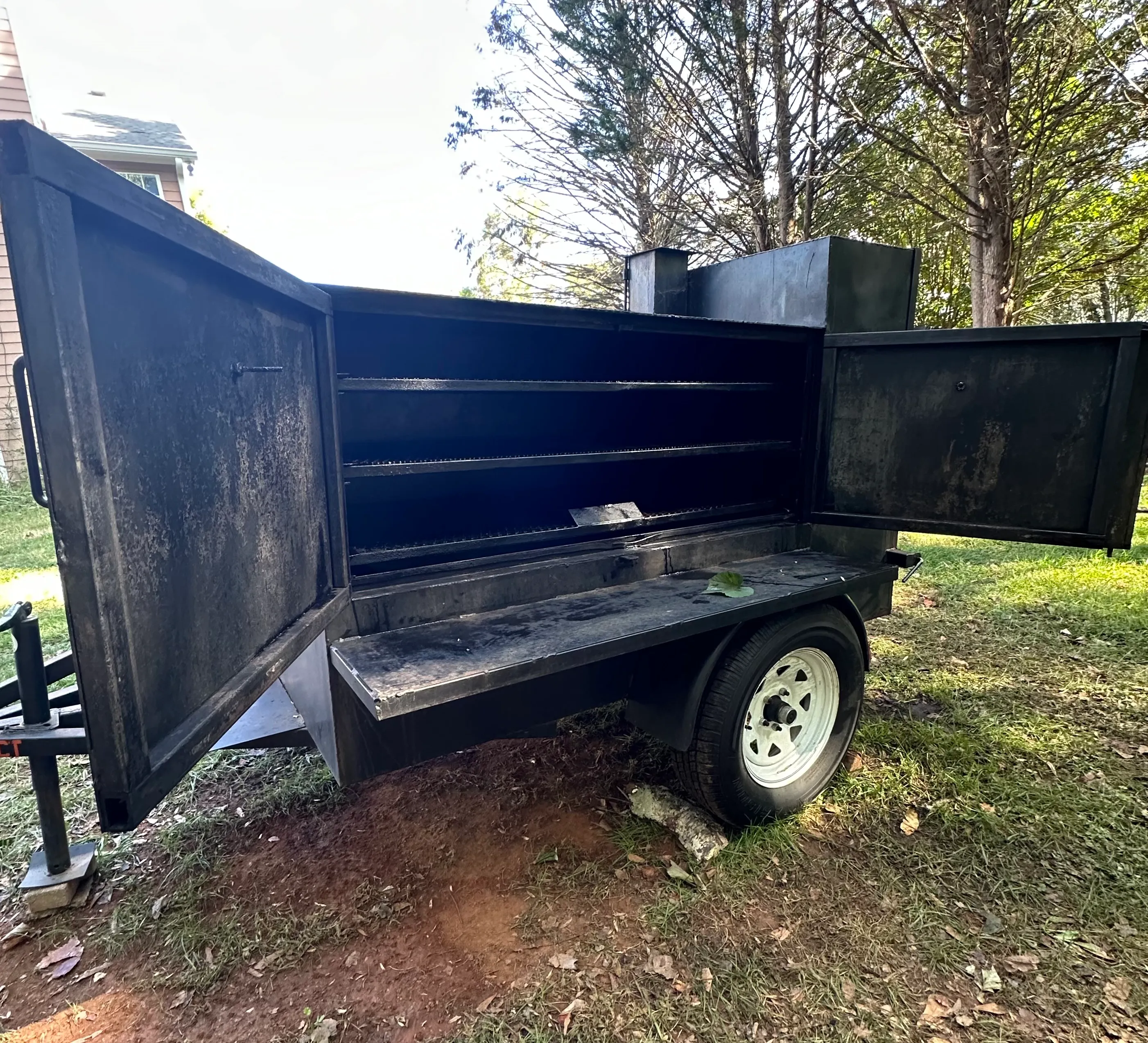Description: All steel smoker grill with 3 sections. Front section is a grilling compartment with two cooking surfaces made of expanded metal. Center section is the smoker with two cooking surfaces made of expanded metal. Back section is divided into two compartments. The top compartment is a warmer compartment built on top of the lower compartment fire box. The warmer compartment has 3 warmer racks made of expanded metal. The fire box has an expanded metal grate for managing the fire on and lower section where ash and coals collect. Grill also has a paper towel holder and grill utensils holder. Grill has an integrated trailer axel and trailer tongue so it can be easily transported by vehicle with a trailer hitch and 2 inch receiver ball. Integrated lights require a 4 pin trailer light adapter.